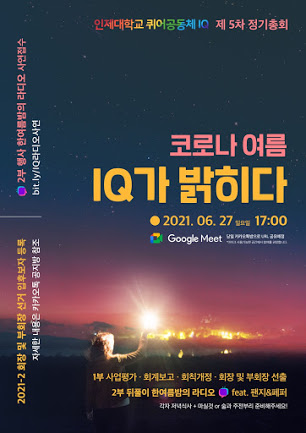 지난 6월 27일, 2021년 1학기 IQ 종강총회가 온라인을 통해 비대면으로 진행되었습니다. 일요일임에도 불구하고 많은 회원분들이 참여해주셨습니다. 또 IQ 역대 가장 많은 내외빈 분께서 축사를 위해 참석해주시기도 하였습니다.