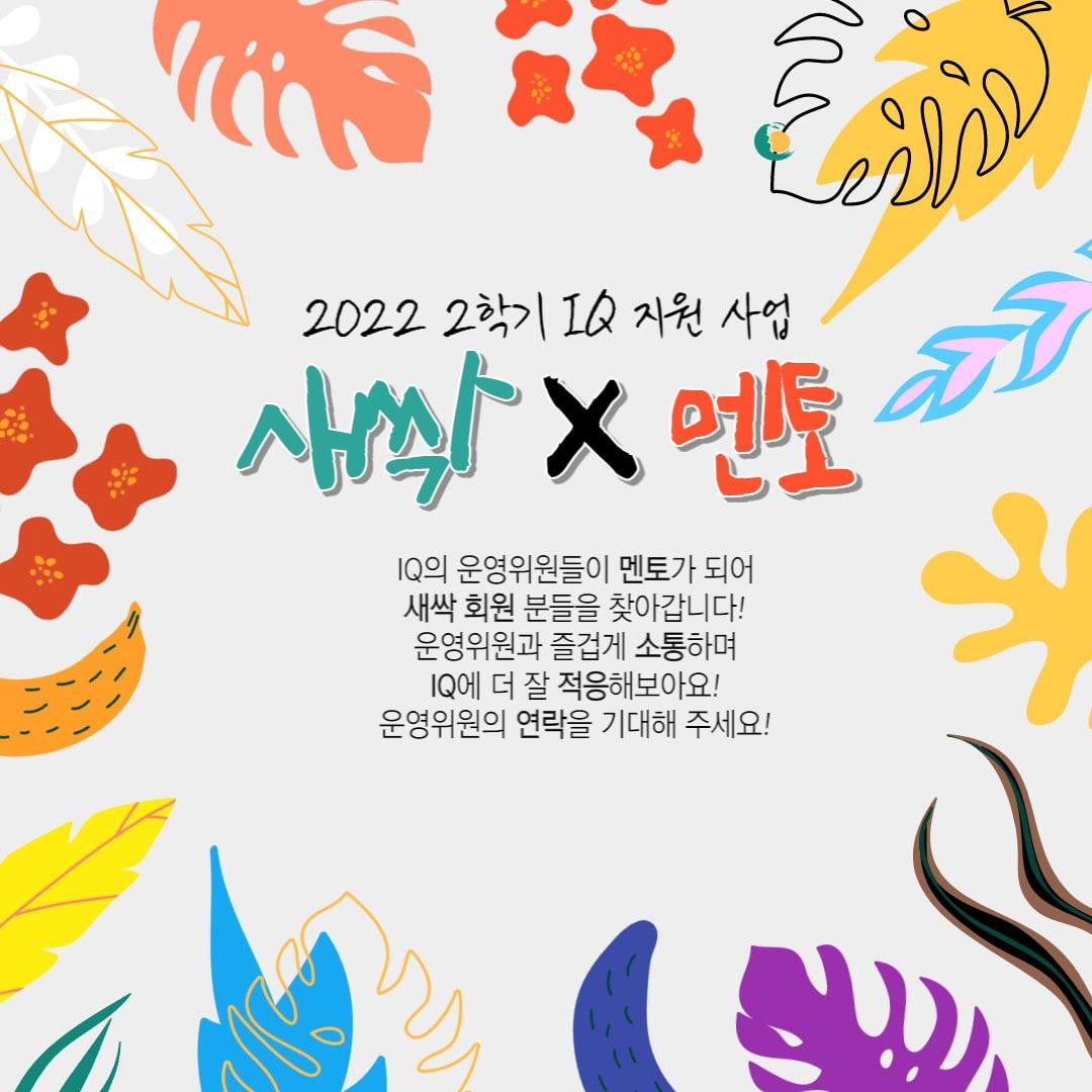 인제대학교 퀴어공동체 IQ는 2022년 2학기를 맞아 운영위원들이 멘토가 되어 새싹회원들을 지속적으로 챙기기 위한 지원활동을 진행합니다. 신규 회원들이 일상적인 활동 속에서 IQ에 소속감을 느끼고 활동을 발전적으로 이어나갈 수 있도록 돕습니다. IQ는 지속 가능한 성소수자 공동체를 만들어나가기 위해 앞으로도 최선을 다하겠습니다.